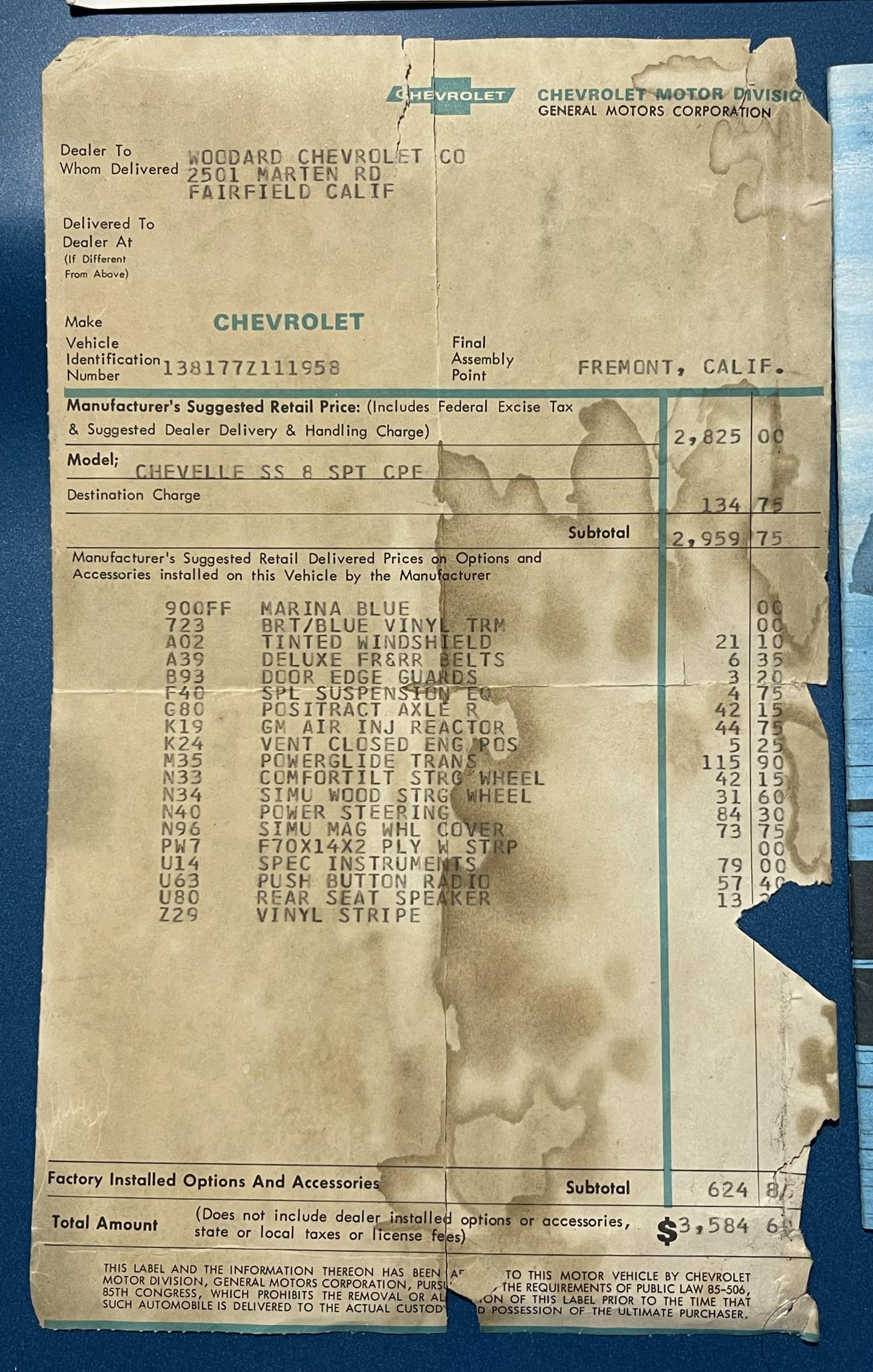 Hi Guys, here is a neat collectible. An original 1967 Chevelle owners manual and related glove box literature. It’s a 1st edition owners manual that has some stains on the covers. Also included is the original window sticker, warranty book/protect o plate. Decodes to an SS 396 engine. Engine code is EM - 396/325 HP with automatic transmission and A.I.R. Smog system aka California emissions. Window sticker has been folded in a few places and has some tears at these folds and small pieces missing. Price is $225 plus $10 to ship. US shipping addresses only please. Payment by personal check or money order only. Thanks Rob