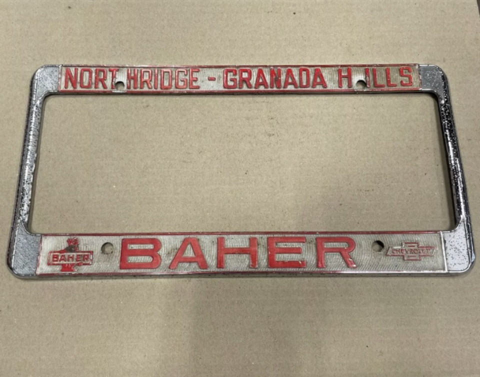 There were 4 variations of the Baher Chevrolet - Northridge - Granada Hills license plate frames from the period of their grand opening Jan 2, 1968 to closure of the dealership in 1988.