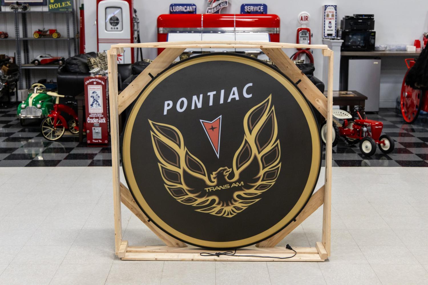This new Pontiac Firebird Trans Am Neon Sign is an awesome display piece for the Pontiac Trans Am collector or enthusiast. It's an impressive size measuring 48” round. The Pontiac Firebird is an American automobile built and produced by Pontiac from the 1967 to 2002 model years. Designed as a pony car to compete with the Ford Mustang, it was introduced on February 23, 1967 which was five months after GM's Chevrolet division's platform sharing Camaro. The second generation Firebird was from 1970 to 1981. The 1977 Trans Am Y82 Special Edition gained significant fame after its film debut in Smokey and the Bandit, leading to a drastic increase in sales of the Pontiac Firebird in the following years and its current day collectability. The black and gold Trans Am along with actor Burt Reynolds are iconic. This Pontiac Trans Am Neon Sign was completed in 2024 and is unused. It was designed with the well-recognized Pontiac Eagle in the colors of black and gold. When the sign is on, the neon highlights the colors on the fascia which include white, red and gold. The sign has an aluminum base with wall mounting brackets. The sign is wired for 120-volt circuitry and has one power switch. The sign also includes a wood shipping pallet. MS CLASSIC CARS purchased this sign in November of 2024. February of 2025 is the first time it's been listed for sale. The dimensions are listed below. Believed to be a one-of-a-kind or limited production item.