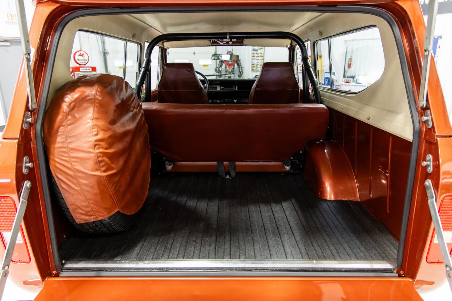 The interior of this Scout complements the exterior perfectly with its original Russet upholstery. The original light tan perforated headliner and sun visors are in excellent condition. It's been outfitted with a cowboy hat holder which was added by the original owner. It's equipped with a black roll bar that was installed by The International Harvester dealer when it was new. The black dash pad was recovered in leather by the original owner. The original tilt steering column, 3-spoke steering wheel, black dash fascia, speedometer, heater and air conditioning controls are in excellent condition. The alternator, temperature, fuel and oil pressure gauges were replaced with NOS. The original bucket seats and rear folding seat still retains the original upholstery along with the original seat belts. The top of the door panels and console with shifters is painted body color. The original orange rubber flooring was replaced with NOS black rubber flooring. Some of the custom features include a chrome fire extinguisher, Autometer tachometer, JVC stereo, center console with wood top, cup holders and storage compartment. The spacious rear compartment houses a full size spare tire with cover. Everything in the interior is in working order including the lights, gauges, stereo, heat and air conditioning system.