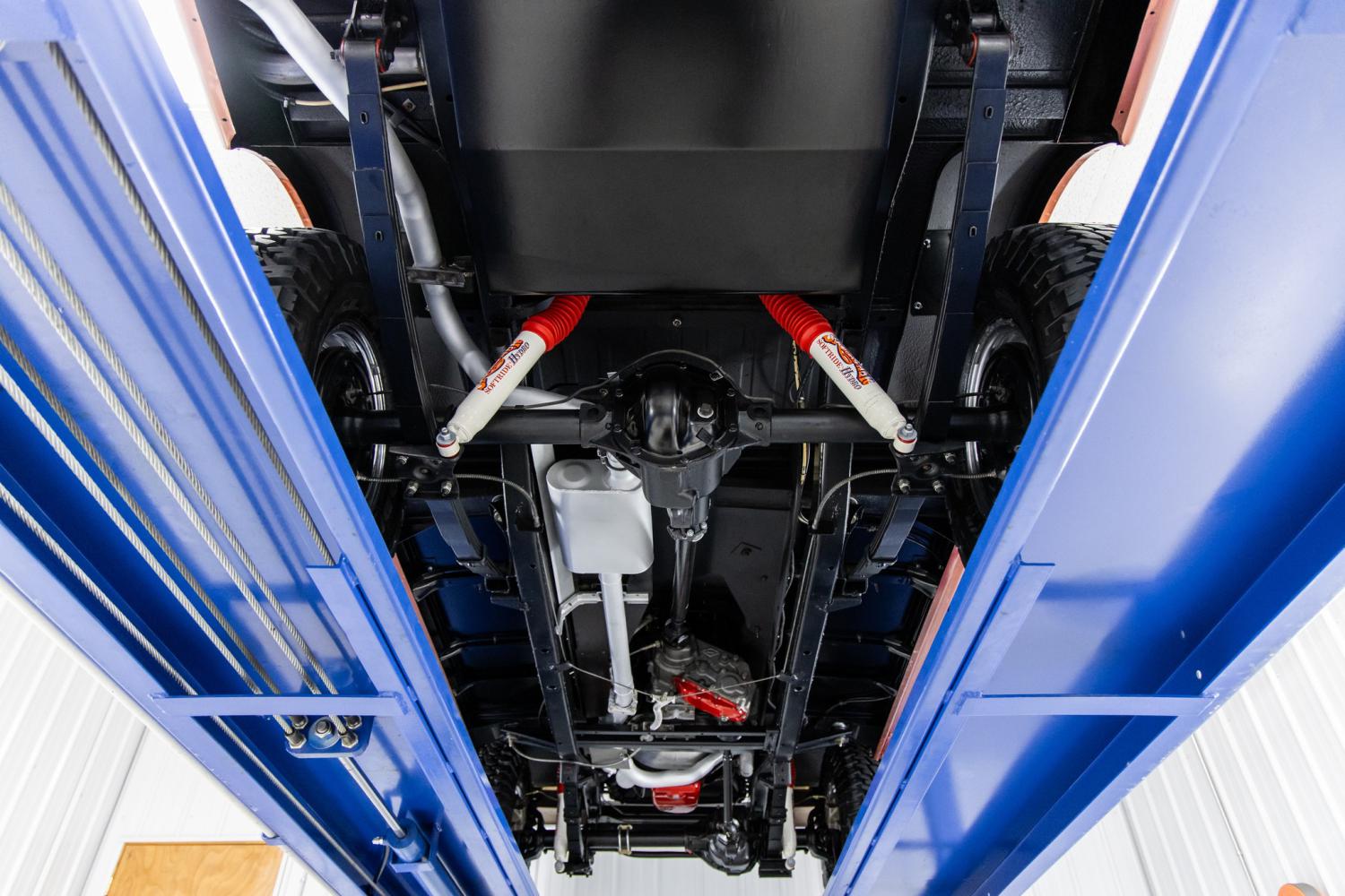 The undercarriage is also nicely detailed throughout with many original parts. The body was never taken off the chassis. The floors and chassis were repainted in the correct shade of black. The power steering pump, box and hoses were replaced. The original fuel tank was restored along with new sending unit and fuel pump. It was outfitted with a Skyjacker 4” lift kit with Softride Hydro Shocks and leaf springs. It's equipped with a power braking system with front wheel discs.