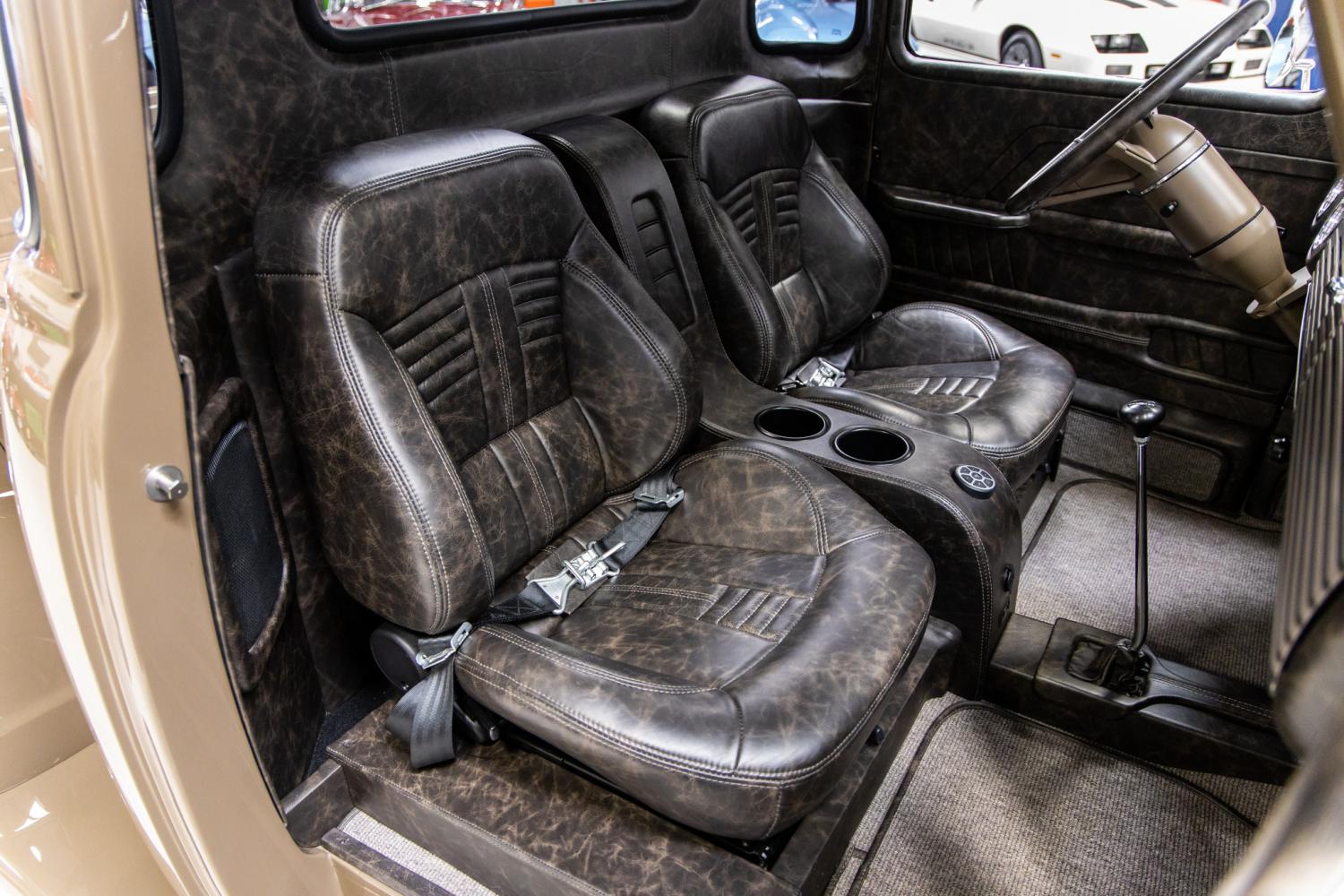 The interior of this 50' Chevy 3100 is very tasteful with its unique design. Revolution stitched up the cabin by covering the dash, American Retro steering wheel, Procar bucket seats, center console and just about every interior panel in distressed leather. It was decorated with a microfiber suede headliner and German weave carpeting with molded floor mats. Some interior amenities include Dakota Digital gauges, Restomod air conditioning, power windows, JL Audio audio system including speakers and subwoofer, Ididit tilt steering column, cup holders, power outlet, USB ports, Clayton Machine Works shifter, handles and pedals. Everything in the interior is in working order such as the lighting, gauges, air conditioning an audio system.