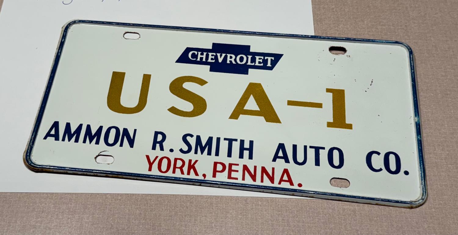 1960’s USA-1 Chevrolet Ammon R. Smith dealership plate. York Pennsylvania famous “Old Reliable”. High-performance Chevrolet dealership. The plate was used, but in very nice condition overall. Has a little bit of paint wear, but it's one of the better original plates I’ve had. Asking $220 including shipping.