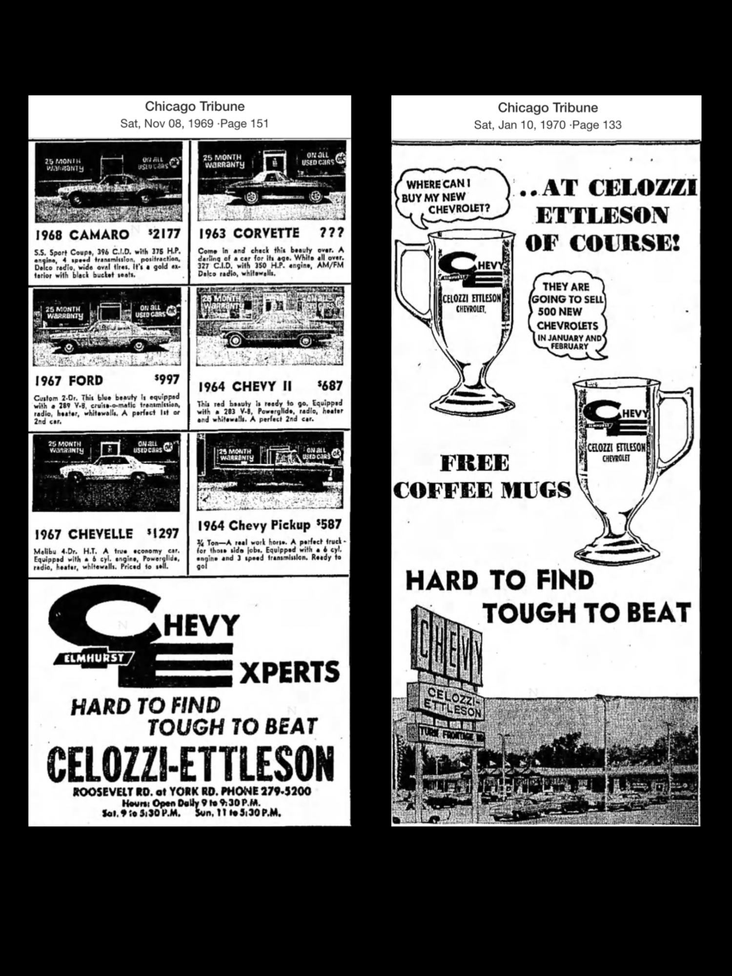 I took a look for Old Celozzi-Ettleson Newspaper Ads but little ‘69 era also most for used cars. C-E must’ve given away tons of Coffee Mugs as 01/70 Ad as there’s lots on eBay today… https://www.ebay.ca/itm/186620910546...90.c101224.m-1 Best of luck finding info/engine/paperwork for your car, love to see/hear more about it. ![]() ~ Pete .