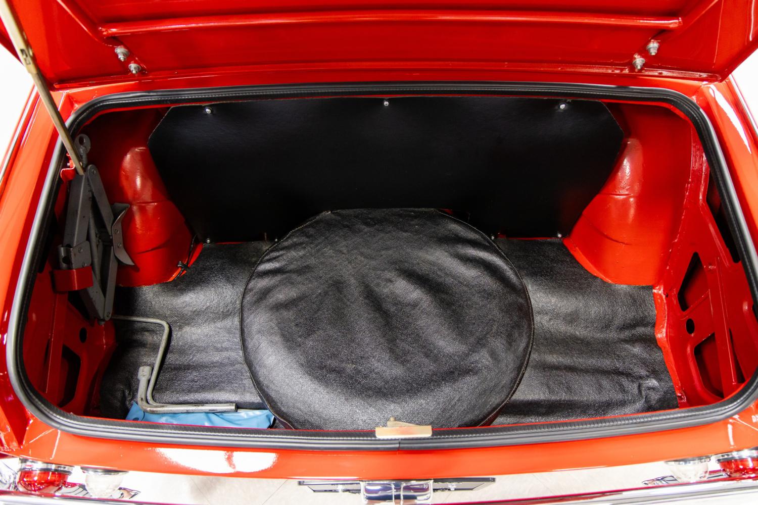 The interior of this car is also in beautiful overall condition throughout. The handsome walnut veneer dash bezel and the hand tooled deep cushioned bucket seats are elegant. The black leather seating surfaces and convertible top cover are decorated with white piping. The banjo style steering wheel fronts Jaeger instrumentation including a 110-mph speedometer, a tachometer, fuel gauge and coolant gauge. The deep dished steering wheel is mounted to a telescopic steering column that is designed to collapse upon impact. Everything in the interior cabin has been restored or replaced new such as the sun visors, rear view mirror, dash pad, dash fascia, door panels, door hardware, wood shift knob, leather shifter boot, seat belts, carpeting and rubber floor mats. It's equipped with a modern Retro Sound stereo. Everything in the interior is in working order including the heating system. The trunk compartment was also stripped to bare metal and repainted in Signal Red. Its home to the trunk mat, spare tire and jack tools.