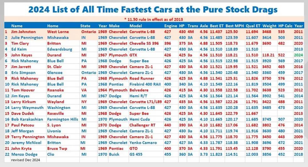 I'm happy to see the 66 L72 Corvette ranked #2. Seeing it ran 12.80's with a 3.36 gear, makes me think it was a "ringer". Specially prepped cars were not beneath Zora