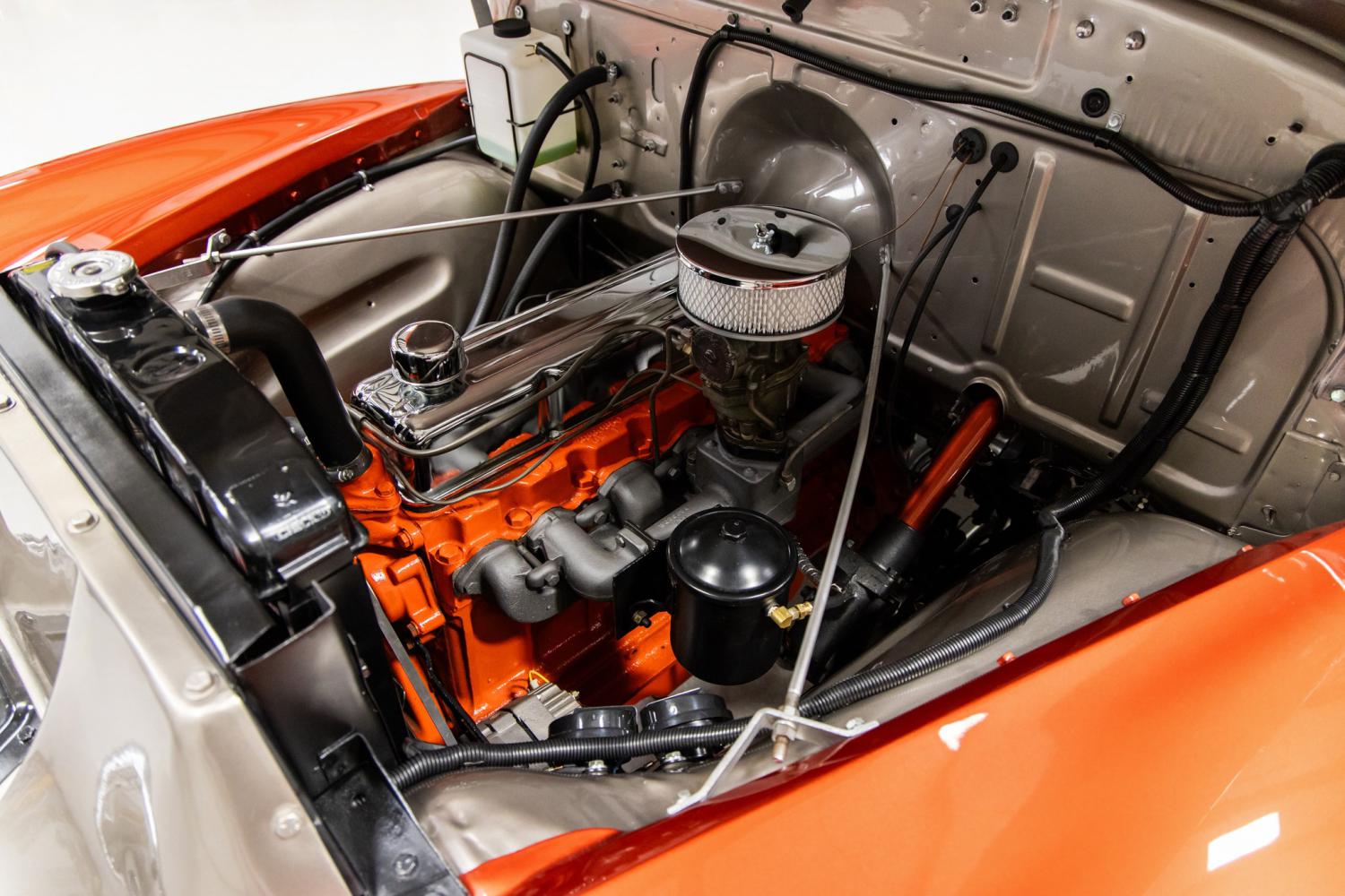 The engine compartment of this '50 Chevy 3100 is very detailed throughout. The backside of the hood, firewall, inner fenders and radiator support panel was refinished in Light Bronze. The 12-volt electrical system is powered by a concealed battery under the passenger floor. The battery has a power cut off knob for storage. All of the wires were covered in wire loom for a neat appearance. The truck is powered by a Z-code 235 Inline six-cylinder that was factory rated with 115hp. This engine was completely rebuilt and runs like a Swiss watch. The engine was painted in Chevrolet Orange and outfitted with a chrome valve cover. The Rochester carburetor is covered with a matching chrome air cleaner. It's also equipped with a 12-volt alternator and PerTronix Flame Thrower ignition coil. Some other new parts include the washer bottle, horns and radiator. The engine breathes through factory manifolds and a new exhaust system. The engine is coupled to a 4-speed manual transmission that operates smoothly.