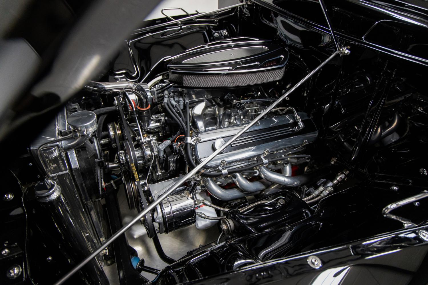The engine compartment is highly detailed throughout with all new parts. It was outfitted a tilt forward hood kit which slides chrome rods. The backside of the hood, smoothed firewall, inner fenders and radiator support was finished in black. It's powered by a fuel-injected 302 V8 crate engine with GT40 aluminum heads. The red engine block was dressed with a Ford Motorsport polished intake, polished water pump, Cook Enterprises machined billet valve covers with 3 black rails, March Performance Style Track billet air cleaner and custom pulleys. The one-of-a-kind valve covers alone were 2,000.00. The Holley Sniper 2 fuel management system and air cleaner was added by the team at MS CLASSIC CARS. Some other upgrades include MSD spark plus wires, Powermaster polished alternator, Specialty wiper motor kit, chrome power steering pump, braided and stainless lines. The engine is cooled by a custom Mattson's aluminum radiator with a dual SPAL electric fans, chrome top hose and billet overfill canister. The engine breathes through ceramic long tube headers and custom dual exhaust system. A section of the exhaust system was wrapped with heat tape. The engine is coupled to a Race Trans C4 automatic transmission with B&M 2500 stall converter. The power is transferred to the Currie Enterprises 9” narrowed rear end with 28 spline axles, 3.25 gears and Chevrolet 5-lug bolt pattern. The rear end was painted high gloss black.