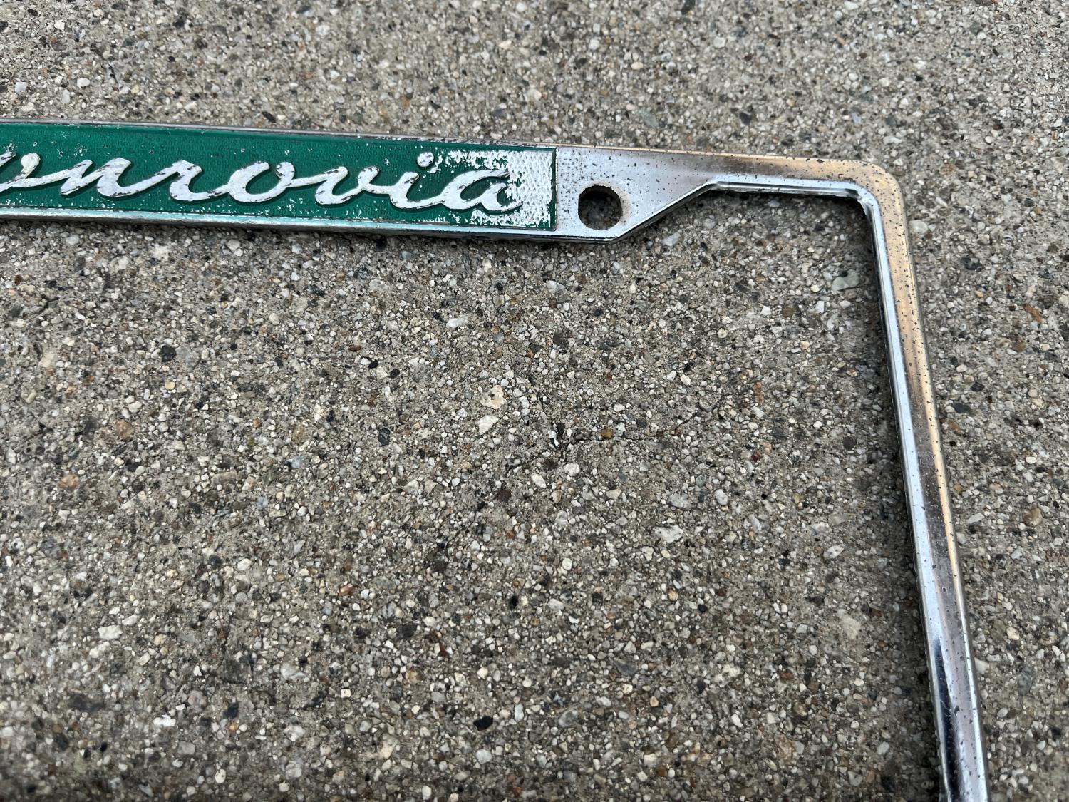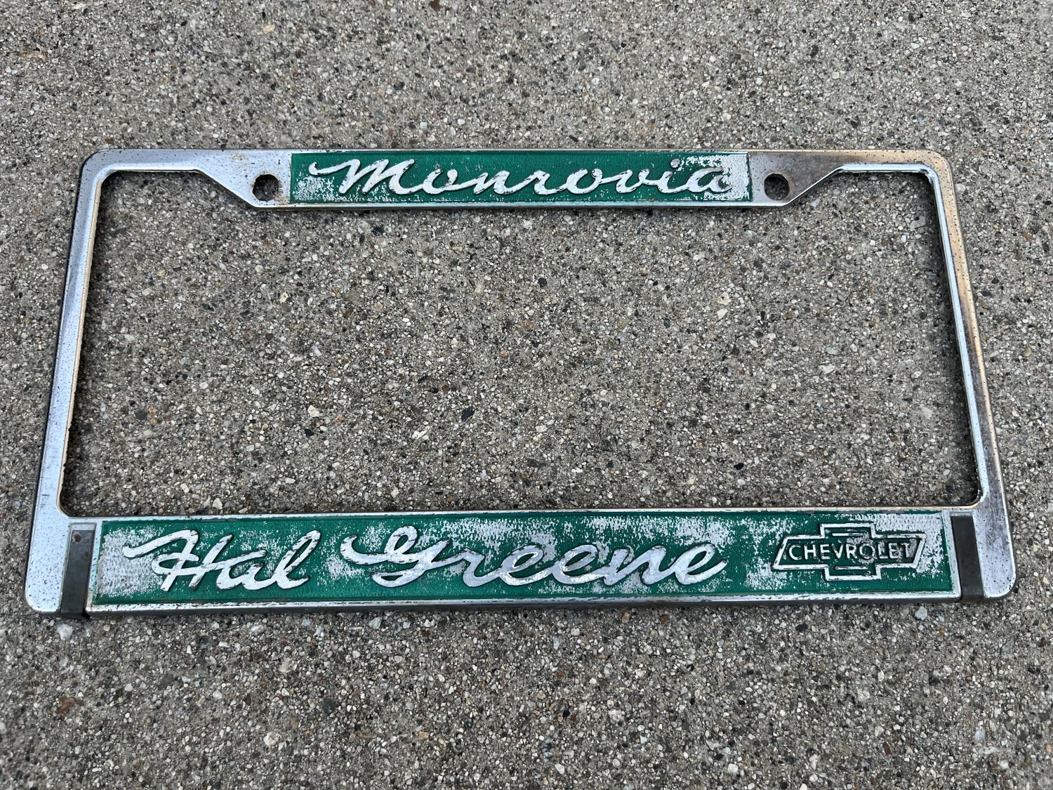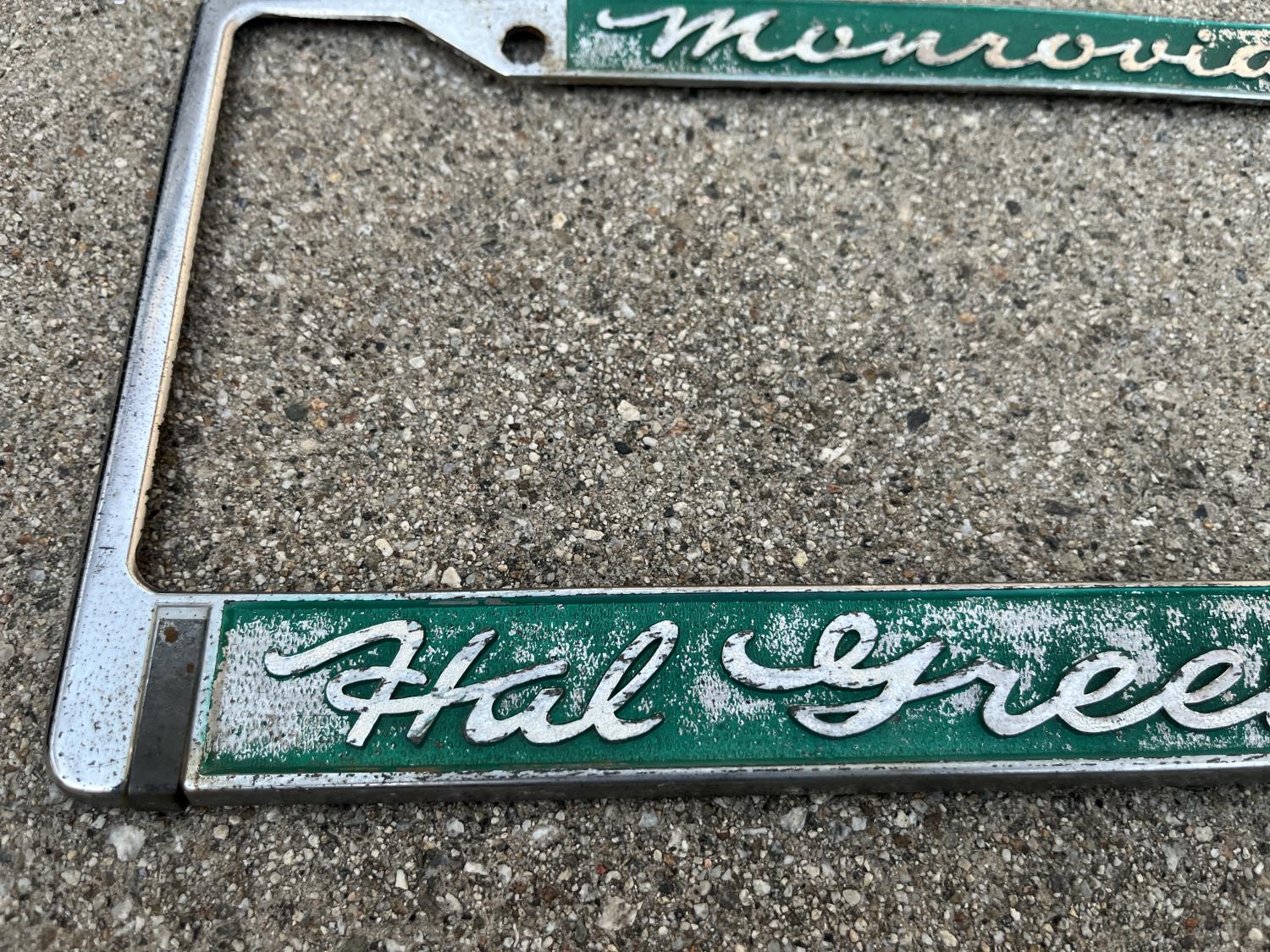 I have a genuine as leather vintage HAL GREENE license plate frame available. It is the green version and has a nice patina to it; it's not perfect but still retains its original chrome finish, I cannot be sure it's original paint though, IMO. It retains its original clips as shown. This is a VERY difficult frame to source in any condition. It presents as a VERY nice survivor piece to me and could be restored I'm sure. It is NOT a reproduction or recreation, it is real in my opinion and shows age. Detailed and up close photos below to show all the detail. NICE eye appeal, again, IMHO. This is an awesome & original frame, and not often seen. It's the details... Cheers all, Anthony |