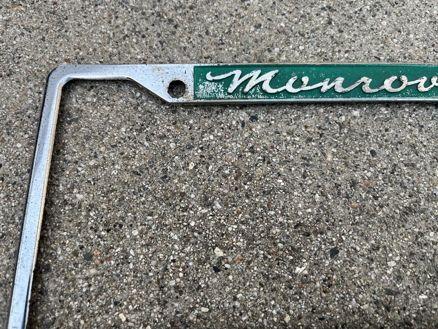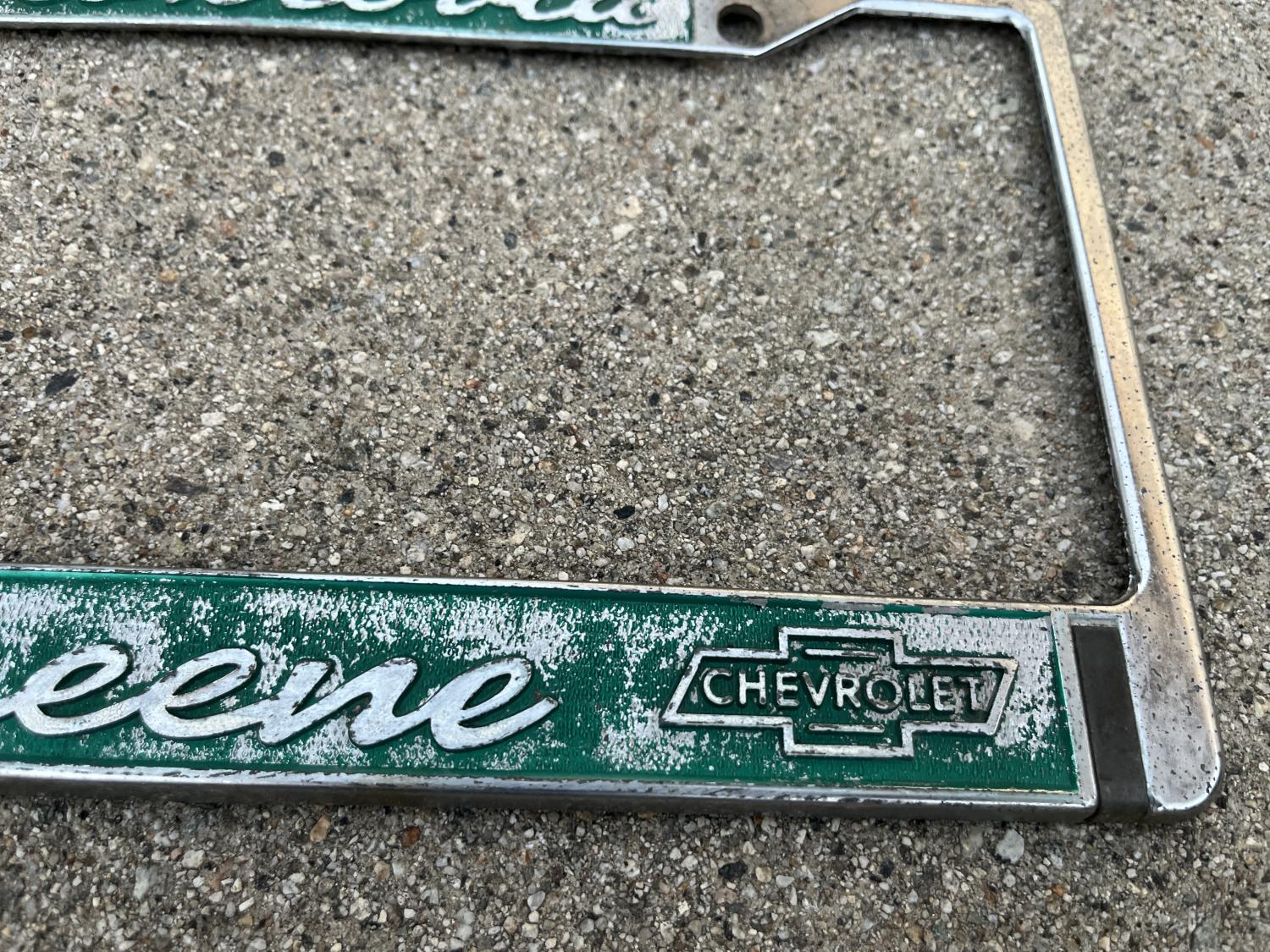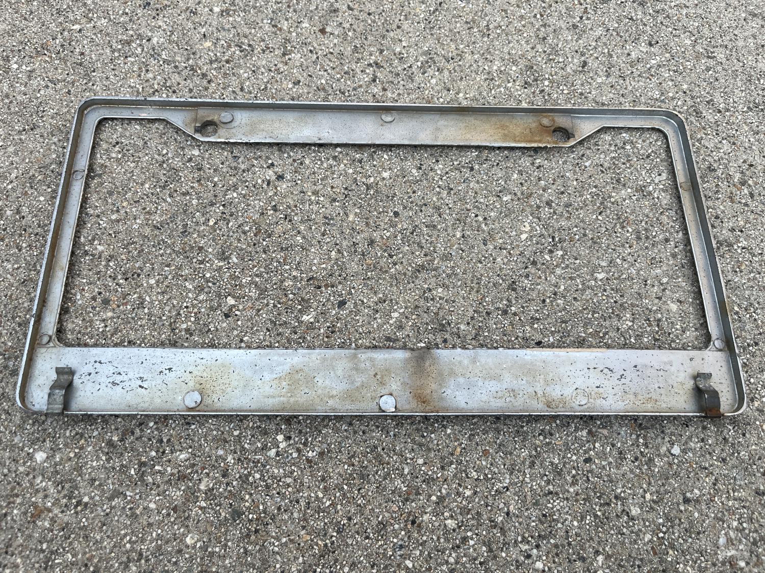 I have a genuine as leather vintage HAL GREENE license plate frame available. It is the green version and has a nice patina to it; it's not perfect but still retains its original chrome finish, I cannot be sure it's original paint though, IMO. It retains its original clips as shown. This is a VERY difficult frame to source in any condition. It presents as a VERY nice survivor piece to me and could be restored I'm sure. It is NOT a reproduction or recreation, it is real in my opinion and shows age. Detailed and up close photos below to show all the detail. NICE eye appeal, again, IMHO. This is an awesome & original frame, and not often seen. It's the details... Cheers all, Anthony |