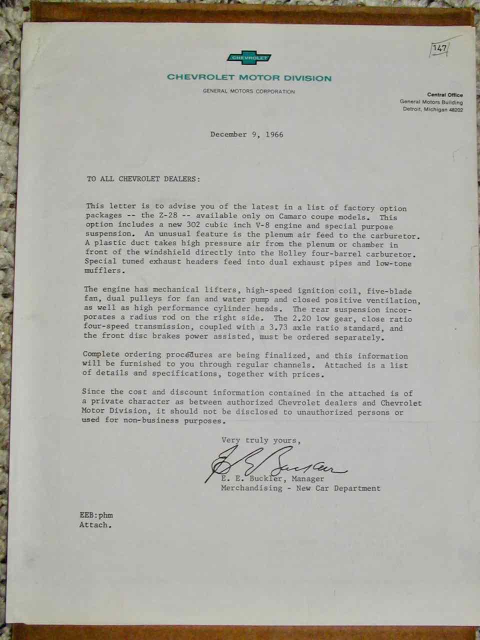 Colorful write-up of his trip from the GM desert proving ground to Detroit in a 67 Z. David was one of my wife's customers so I asked her to have this copy signed. She said he was a super nice guy.