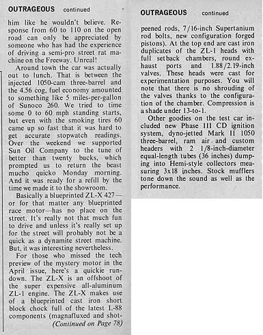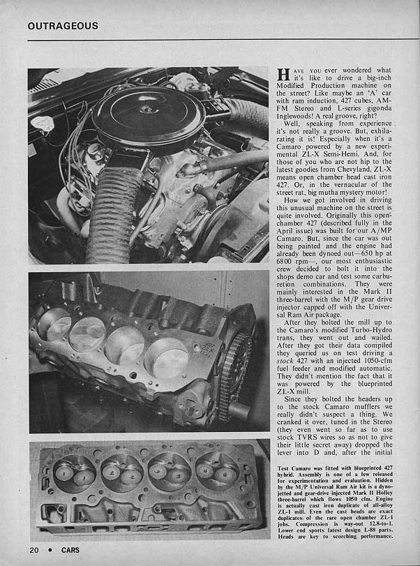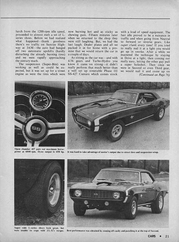 From Chevy Action 1975 HOW TO SET UP A 427 CAMARO out of M/P:Chuck H.,who runs out of Millington Pit Stop in Millington Tenn. campaigns this supertrick 69 camaro powered by a phase III ZL/X competition engine complete with open chambered aluminum heads and a pair of Dominator quads.The phase III ZL/X engine is rated at over 600 hp.This car was built for the super/stock and modified production class.This article is for the car that is for sale. Though good info in the previous post the car for sale is not that car. <font color="blue"> [This car has a certificate from M/P and copies of the original work orders plus/]