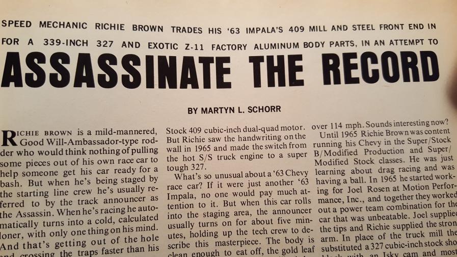At the '67 or '68 Rod & Custom show at the (then) N.Y.C. Coliseum, I saw a '63 Impala Sport Coupe on display with a sign in front of it stating it was Richie Zul's Z-11. There's also a photo of it in one of the early magazines. The car was part of a display of Motion Performance cars. I've been trying to track down information on this car for Rusty Symmes and myself to determine if it was really a factory Z-11 car. I've contacted Joel and he says the car was not sponsored by Motion, nor was it a Z-11. Joel gave me some old numbers to try to get in touch with Richie, but neither Rusty nor myself have been successful.