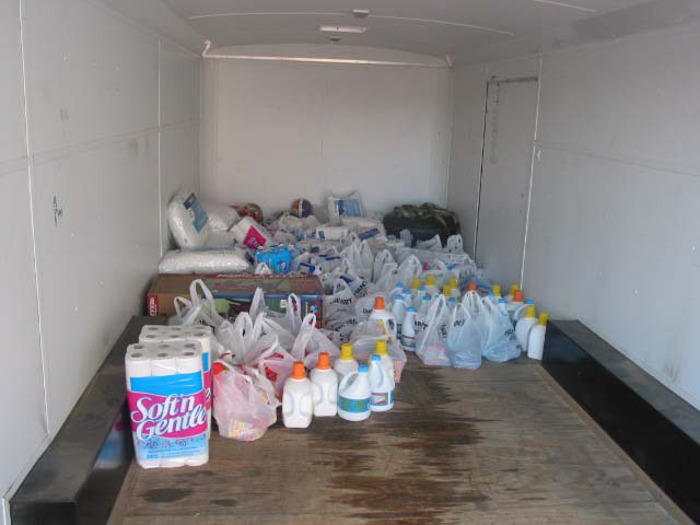 To help with hurricane relief, at the banquet Friday evening during SCR8, we had a aution of a few supercar related items, plus a basket set up for donations. This, coupled of with a donation from the sYc, totalled $2000.00. This afternoon my wife Diana and Rob's wife Anna went to Wal-Mart to buy supplies for shelters in Arkansas. Here is our trailer in front of Wal-Mart waiting to be loaded.
