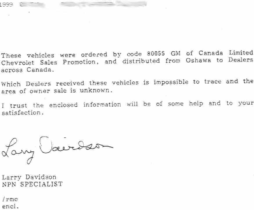 From Zedder: ....the 80055 GM Oshawa account was a Sales Promotion Account, not a "Show car" account. Over the years, this term has been used incorrectly by some at GM Vintage Services - especially in the early days when much of this information was just being figured out. From me: 80055 is basically the dealer code for the Oshawa zone office. It does appear on other non-IPC cars. I'm not sure what GM of Canada says 80055 means now, but I recall seeing the definition vary. How was this car optioned? |