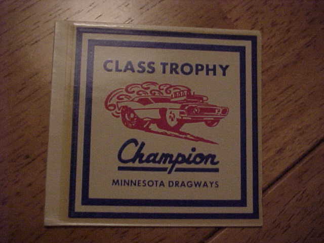 Twin city dragstrip and Minnesota dragway Class trophy champion. water decals not repros. 25.00 for the 2 items,or 13.00 for one,your choice.
