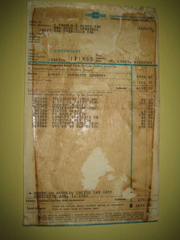 to try and trace it's history. The story I got was it was purchased in San Francisco and I picked it up in Santa Rosa(Northern Ca for those who don't know). So it's been in the SF bay area it's whole life. I have a form from the CA DMV which looks like it could do the trick. DMV form INF 70R. It is a request for VR/ Vessel Record Information. One of the choices is Ownership History. Has anyone used this form? Had good luck with it? I was also trying to find out Chevy dealers in San Francisco in 1969, but google can't seem to help(or I can't help google :-)). I figured if I can get a list of dealers, I'd start calling and see if there might be any records. Would anyone have an idea on finding dealerships? I'll start with the one dealer I know (Ellis Brooks) who has been in business a long time. Thanks Ken |
