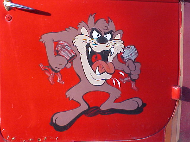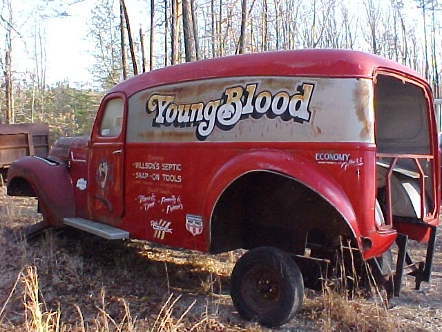 It is an all steel body that has been tubbed out and finished inside the panel truck with aluminum. It has "YoungBlood" on each side and also the Tazmanian Devil on each door.